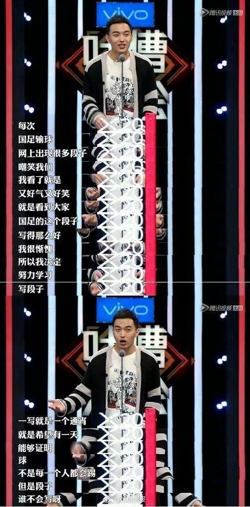 最后登场的主咖冯潇霆面对众人的“吐槽”,一一还击,而最经典的当属对网络上其“段子手”的称呼回应:“看到大家黑国足的段子写得那么好,我很惭愧,所以我决定,努力学习写段子,一写就是一个通宵。就是希望有一天能证明:球不一定每个人都会踢,但段子谁不会写?”