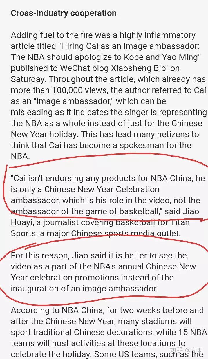 “蔡不代言中国NBA的任何产品,他只是中国新年贺岁大使,这是他在视频中的角色,而不是篮球比赛的大使, ” 应将视频作为NBA一年一度庆祝中国新春活动的一部分,而不是他担任形象大使的就职典礼。