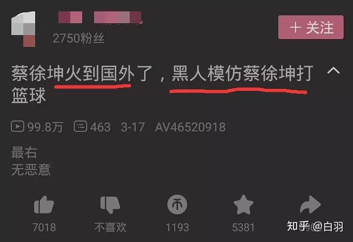 外网上一年前上传发布的蔡徐坤自我介绍的那段视频播放量并不算高(3万),远远低于国内说“黑人模仿蔡徐坤打球”的播放量(100万)。油管视频发布初期的评论中可见,绝大部分观众也并未将这段篮球舞蹈当作真正的球技展示去点评技术。