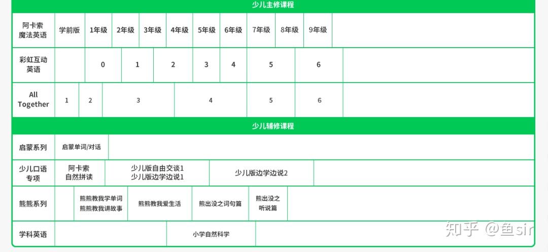 主修课有:阿卡索魔法英语、彩虹互动英语、All Together三种;辅修课有:启蒙系列、少儿口语专项、熊熊系列,还有学科英语即小学自然科学。