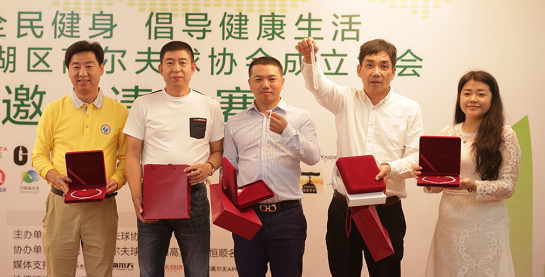 接下来由罗湖区高尔夫球协会会长付萍女士为罗湖高协副会长兼组委会主席林丹凤女士、副会长龚秀丽女士、副会长盛华女士,秘书长周伶俐女士授牌。