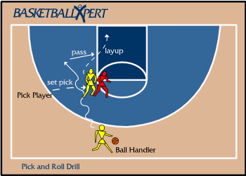 Pick-and-roll:挡拆战术。进攻队员给持球的队友作掩护,英语叫"set a pick",然后掩护队员向篮下移动叫"roll",再接队友的传球,在无人防守的情况下投篮。以pick为基础衍生出的战术还有pick-and-fade、pick-and-split等。