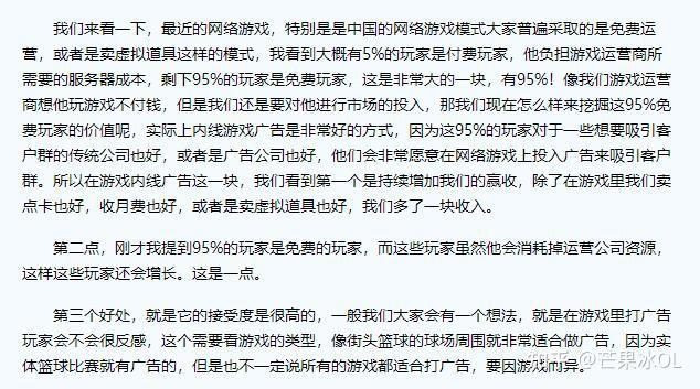 在2007年的ChinaJoy高峰论坛上,天联世纪CEO邓润泽曾以“游戏内嵌广告开创免费网游运营新模式”为主题发表了演讲。简单概括就是,根据二八原则,网游中付费玩家总是少数,付费率也有天花板难以突破,但剩余的大多数用户并非无价值的,为免费网游加入游戏内嵌广告,就能“间接的使95%的非付费用户也为游戏提供价值”。