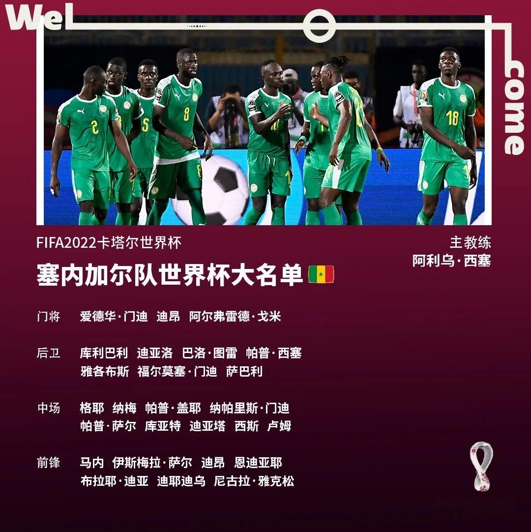 前锋:马内(30岁/拜仁)、伊斯梅拉-萨尔(24岁/沃特福德)、迪亚(25岁/萨勒尼塔纳)、班巴-迪昂(22岁/马赛)、迪德希欧(29岁/阿兰亚斯堡)、尼古拉斯-杰克逊(21岁/比利亚雷亚尔)、伊利曼-恩迪亚耶(22岁/谢菲联)