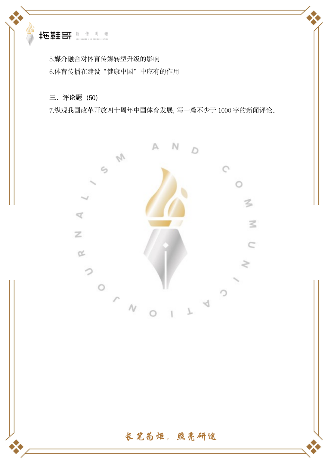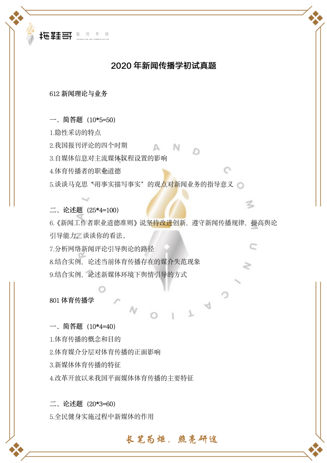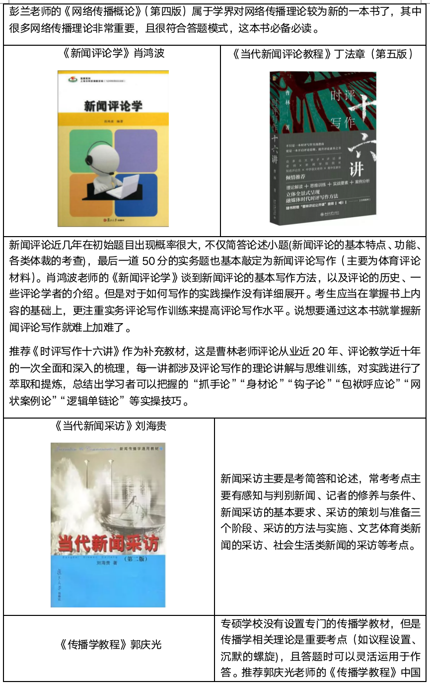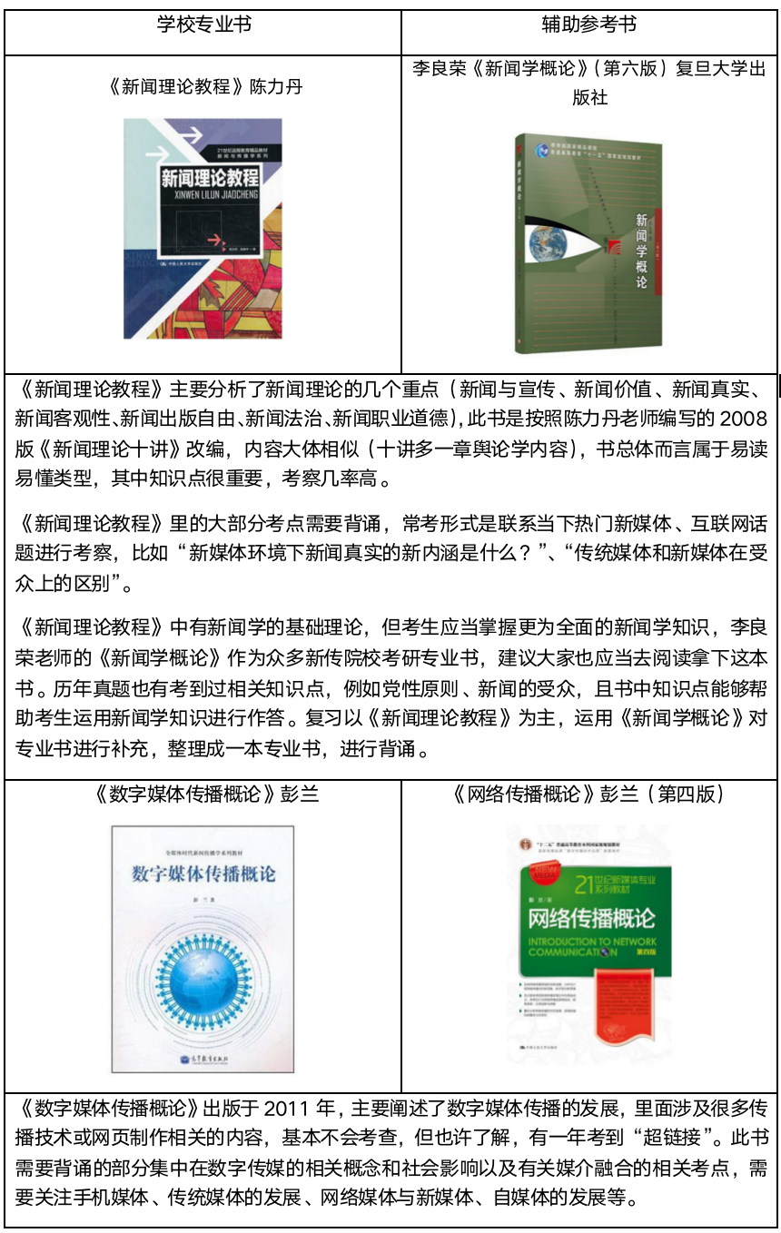 上体专硕有四本参考书,《当代新闻采访》和《新闻评论学》考查知识点多为书本固定内容,除体育新闻评论实务大题外。《新闻理论教程》和《数字媒体传播概论》通常结合新媒体/互联网的大环境进行考察,有时会结合一些热点,如“短视频、自媒体、公民记者”来考查,书上的知识也要掌握透彻。