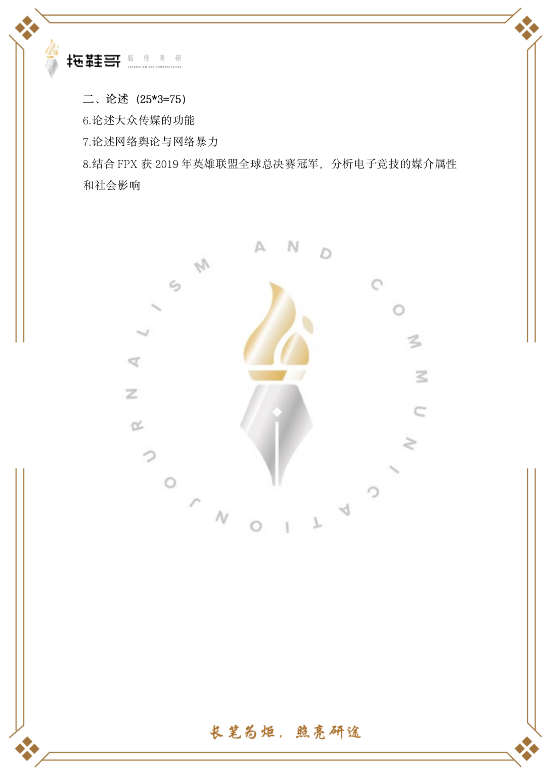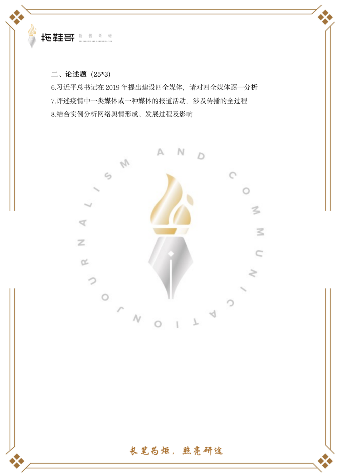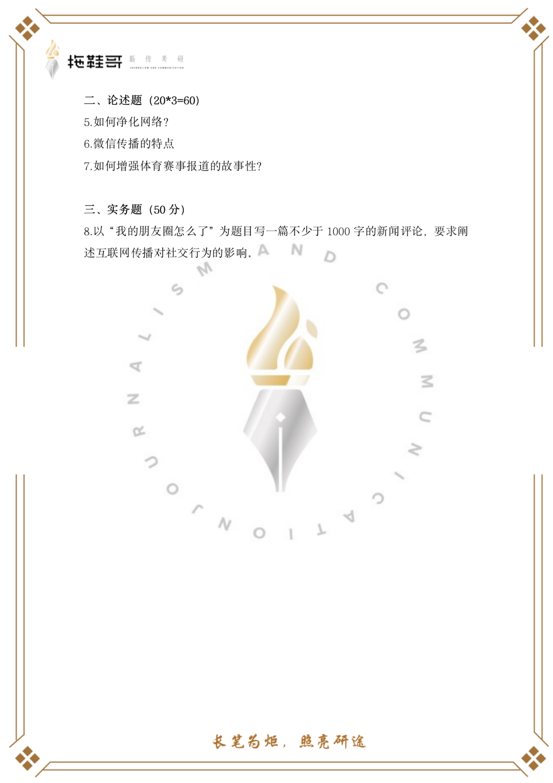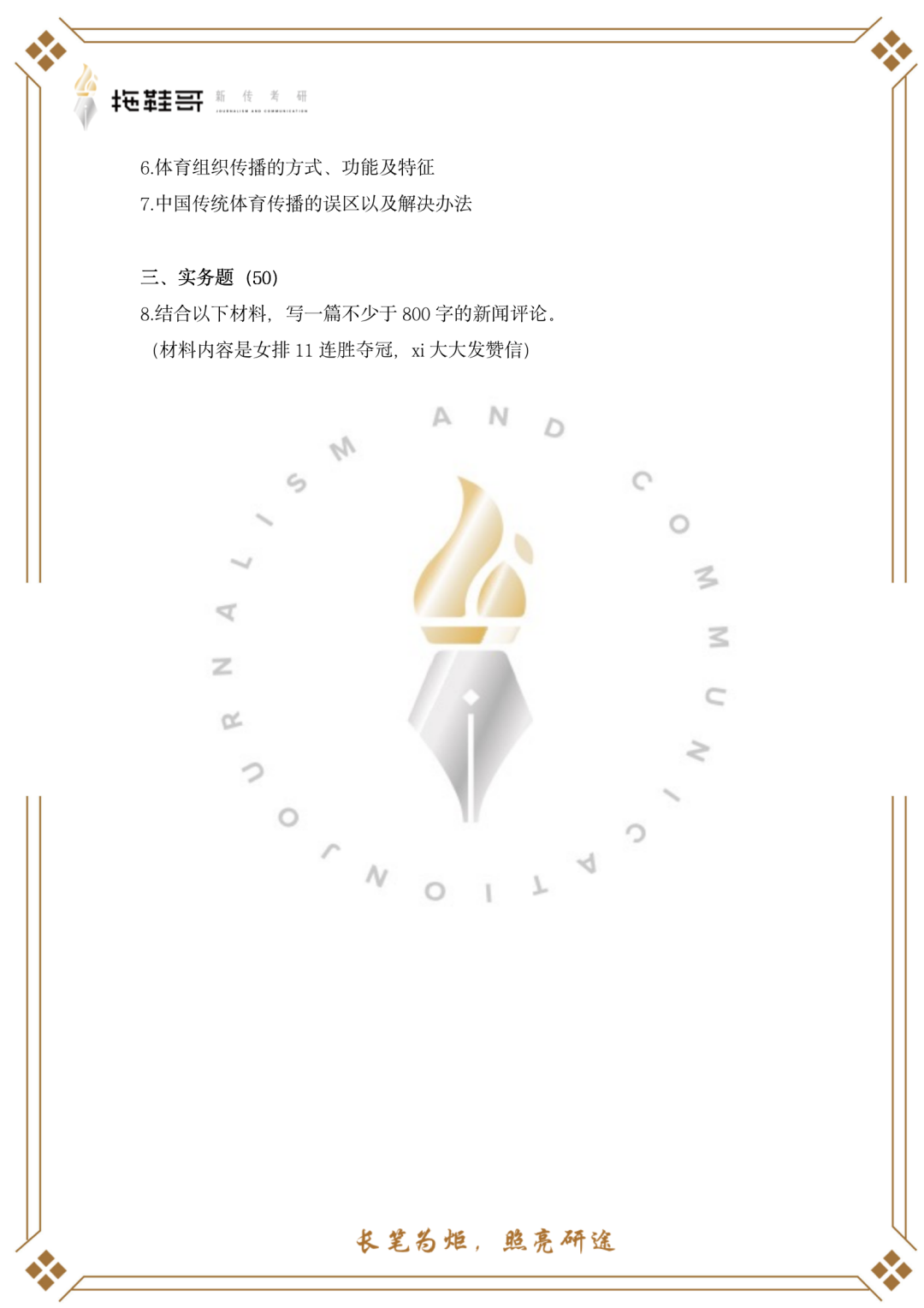 上体专硕有四本参考书,《当代新闻采访》和《新闻评论学》考查知识点多为书本固定内容,除体育新闻评论实务大题外。《新闻理论教程》和《数字媒体传播概论》通常结合新媒体/互联网的大环境进行考察,有时会结合一些热点,如“短视频、自媒体、公民记者”来考查,书上的知识也要掌握透彻。
