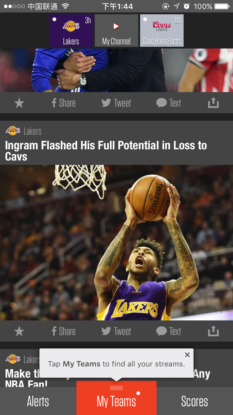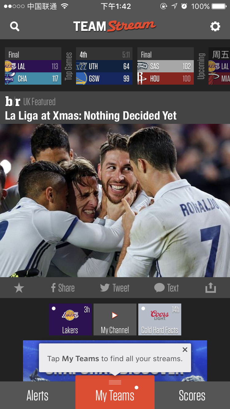 TS是和NBA等体育联盟官方合作的app,其中包括了深度的球队定制,选择了这个球队后,以后出现的各个板块资讯就都是这个球队相关的了,至少是和所属联盟相关的。当然了,英语学得好的同学来吧~~
