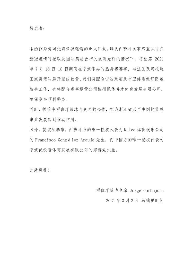 2021年9月中旬,我方委托西班牙律所向西班牙职业篮球联赛(ACB)和西班牙国家篮协进行授权书与合同确认。