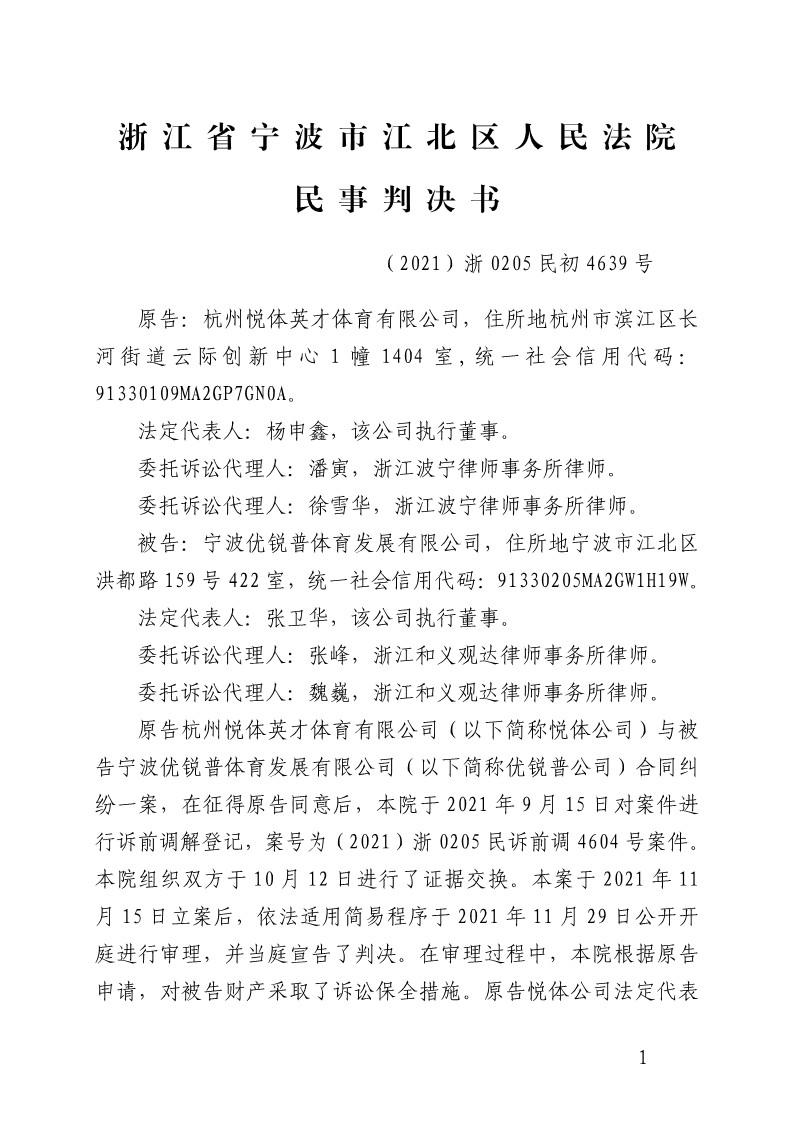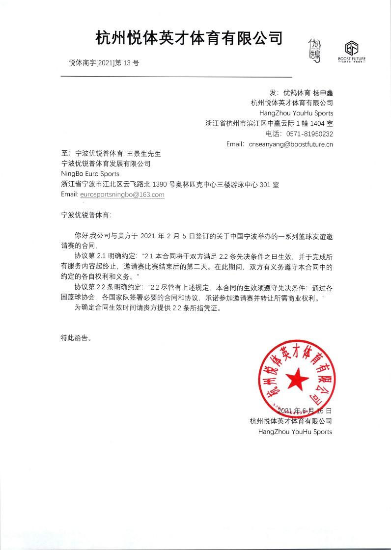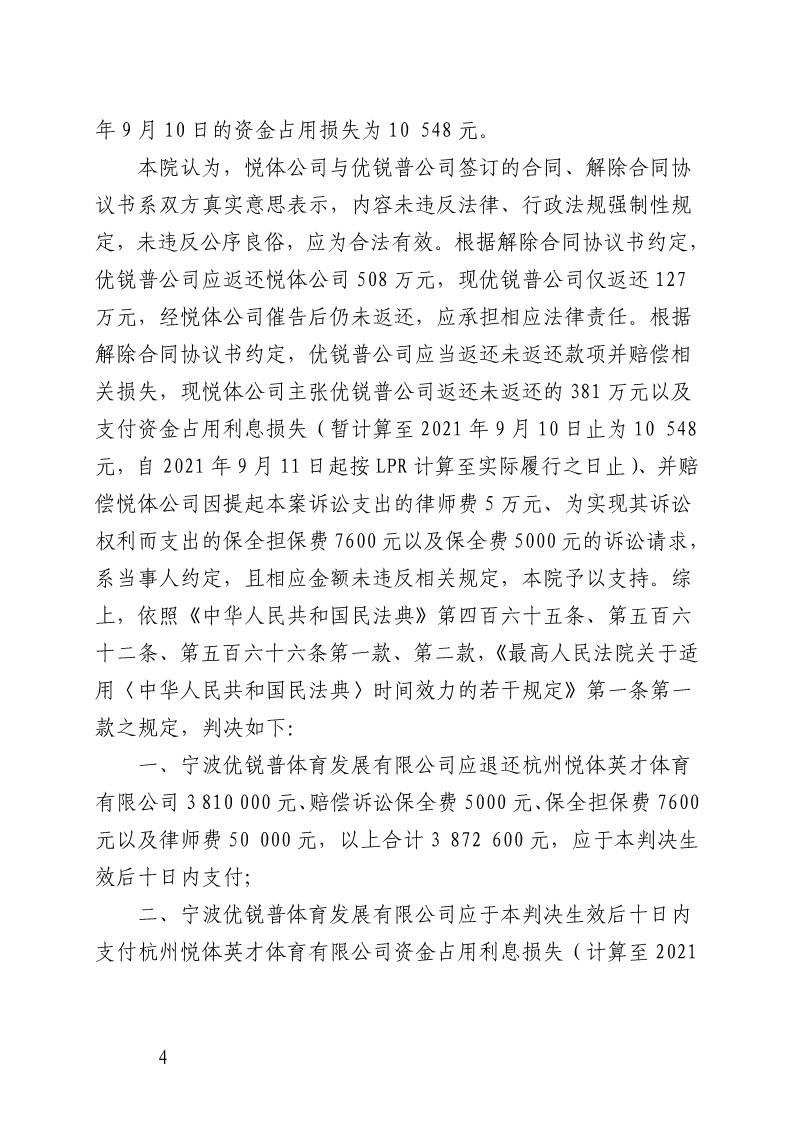 2021年6月30日,我方与宁波优锐普在宁波奥体签订了篮球比赛承办合同解除协议书,合同规定,若无后续赛事协议签订,宁波优锐普体育发展有限公司需在2021年7月20日退还赛事全部款项共508万。