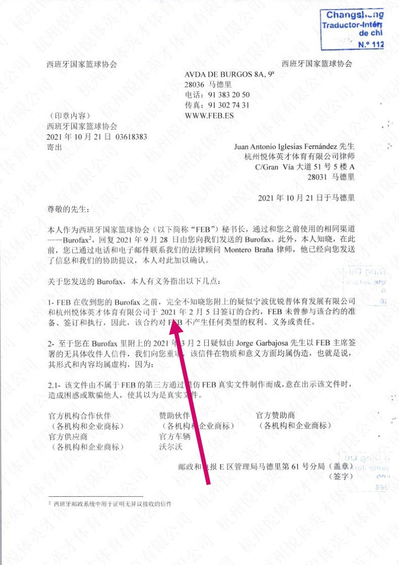 2021年10月22日,我方收到西班牙国家篮协回函,回函明确表示西班牙篮协没有授权任何中国公司,郑博龙方提供的授权书为伪造,并且没有收到我方任何款项。