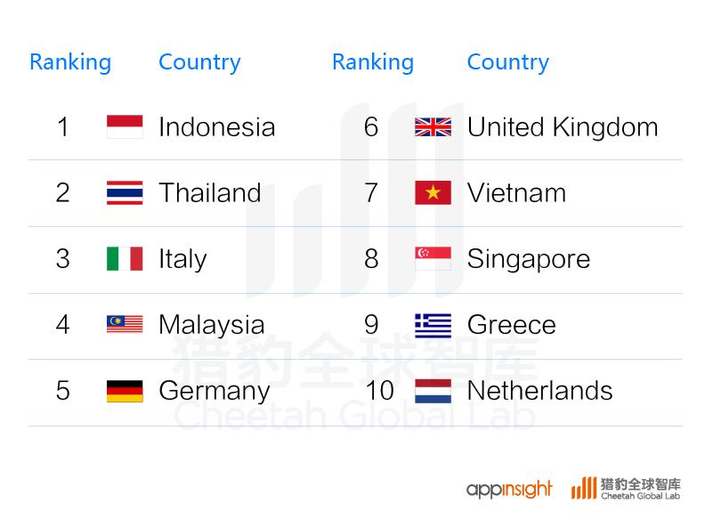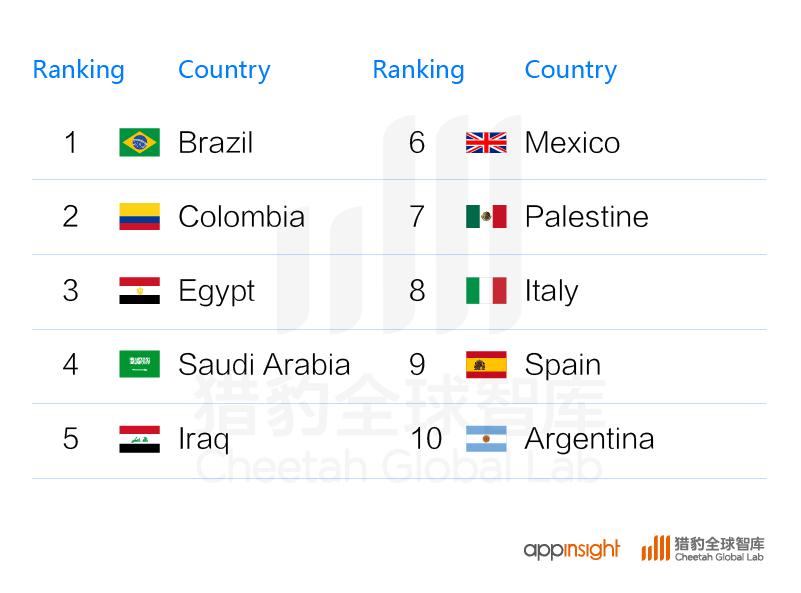 365Scores的用户分布前十名(图注:由于数据来源appinsight,App用户分布可能受到猎豹旗下产品分布的影响)