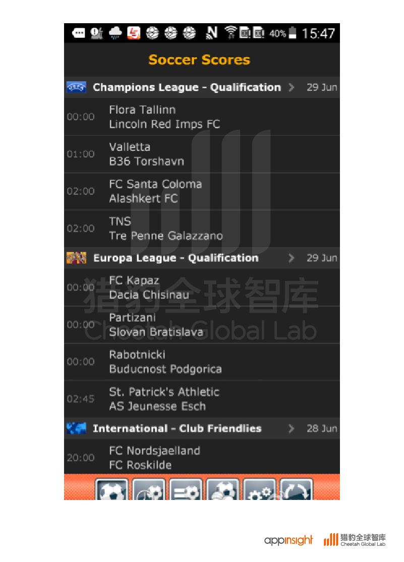 在国际化方面,livescore是数据表现最好也最稳定的一款产品。成立于1998年,也是从网页端转向移动端的产品。总部位于法国,却在东南亚也有比较大的影响力。livescore能突破文化壁垒的原因,是因为其只有比赛数据,如多少分谁获得黄牌,多少分钟时谁破门得分。