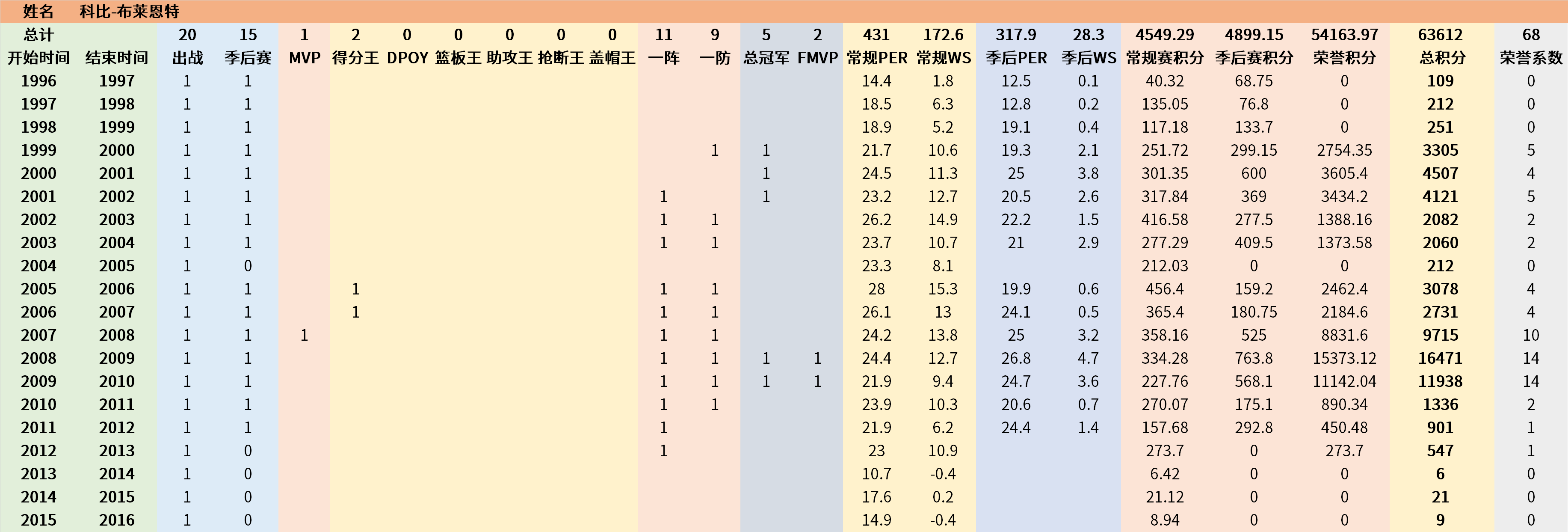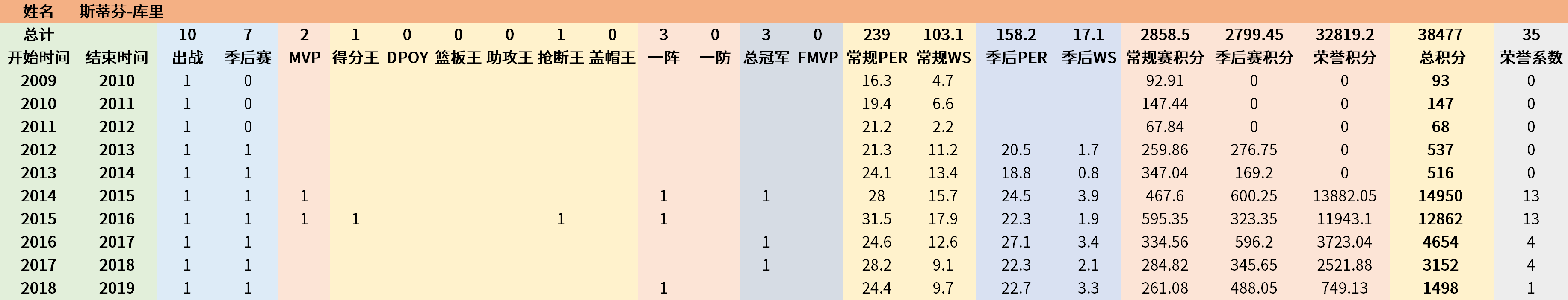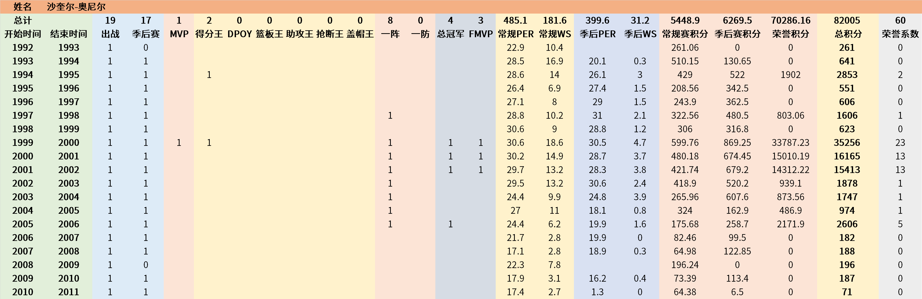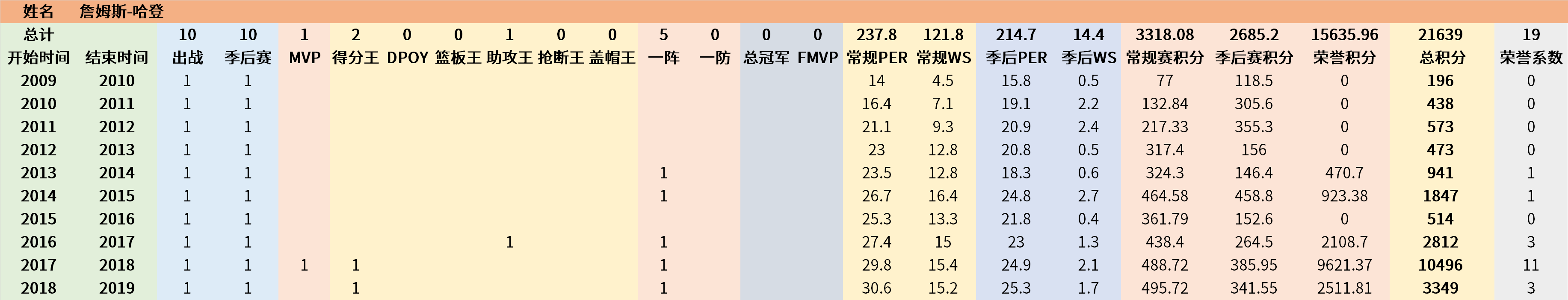每名球员的生涯总成就积分=生涯所有赛季的单赛季成就积分总和
