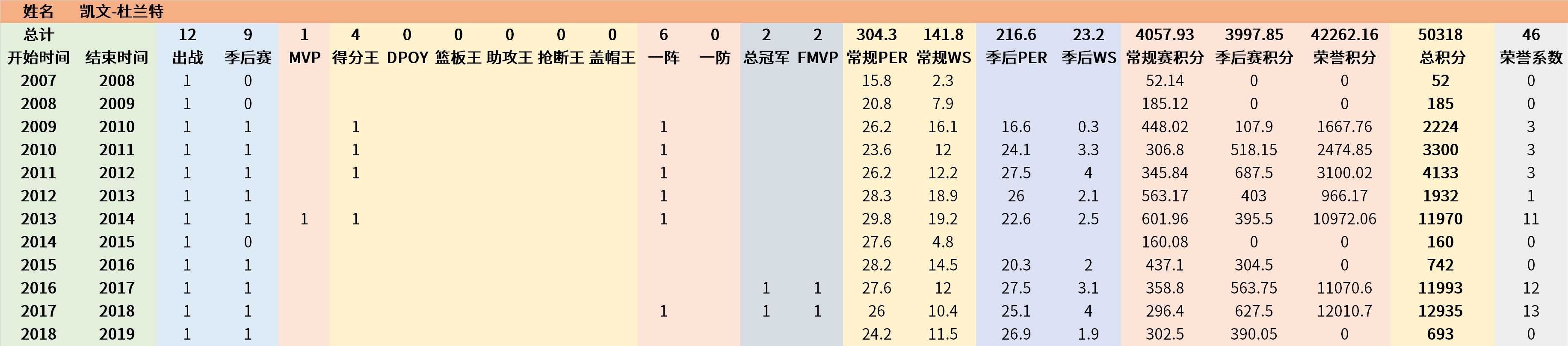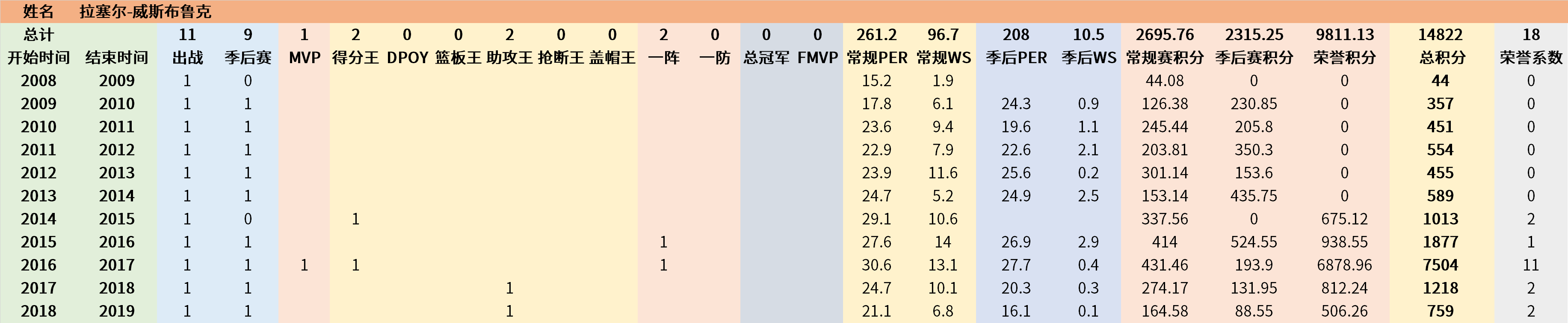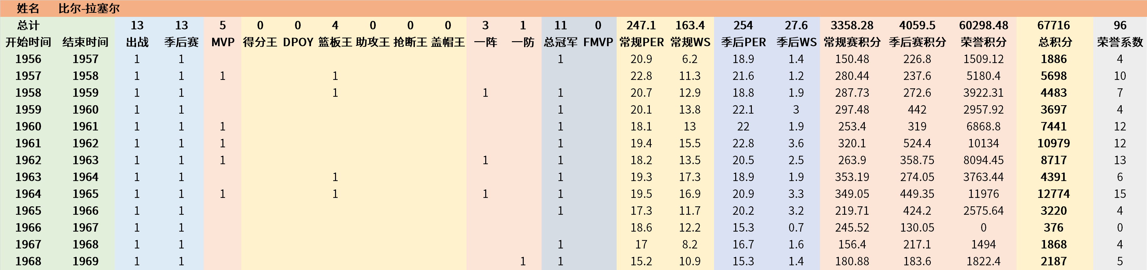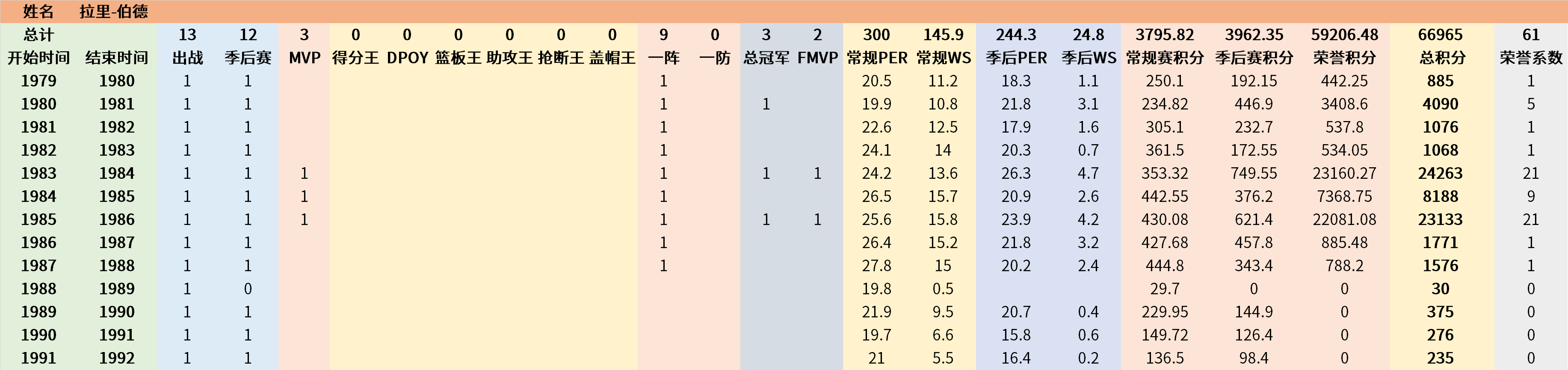 每名球员的生涯总成就积分=生涯所有赛季的单赛季成就积分总和