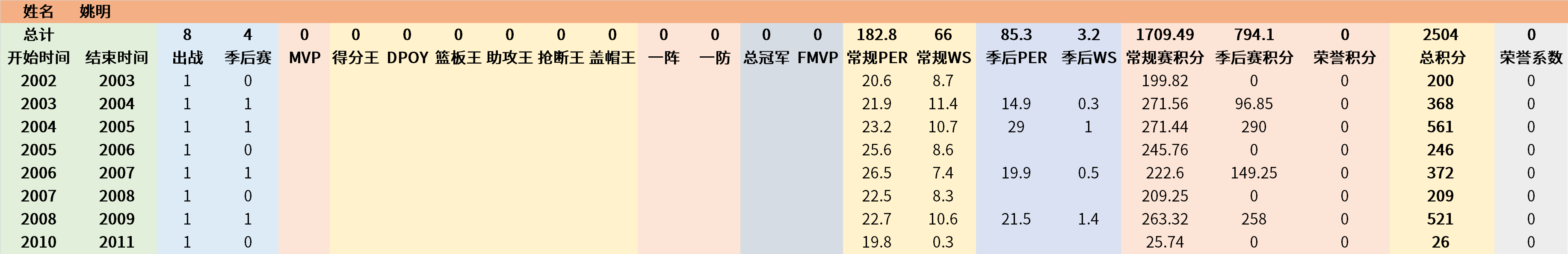 姚明是目前在NBA成就最高的华人。姚明一共出战8个赛季,PER值以及WS值表现都还不错,可惜姚明取得的荣誉称号太少,而且进季后赛的次数过少。再加上职业生涯时间过短,导致整体积分水平相对较低。
