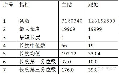 如表4-1,是爬虫获取到的数据概况。可能虎扑数据库的content字段类型为varchar,最大长度为19999,因此主贴和跟帖的最大长度接近或等于这个数。