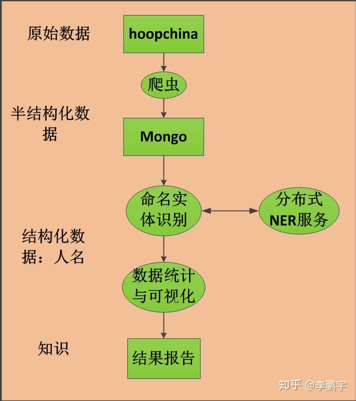为了知道谁是虎扑篮球热度第一人,我需要一份虎扑数据,需要从数据中识别出命名实体并做简单的计数。为此,我需要3个工具:(1)一个用来获取虎扑帖子数据的爬虫;(2)一个用于从文本中抽取人的名字的工具;(3)一个用来对人名进行个数统计和可视化的工具。如图2-1,是用于完成任务的系统结构。
