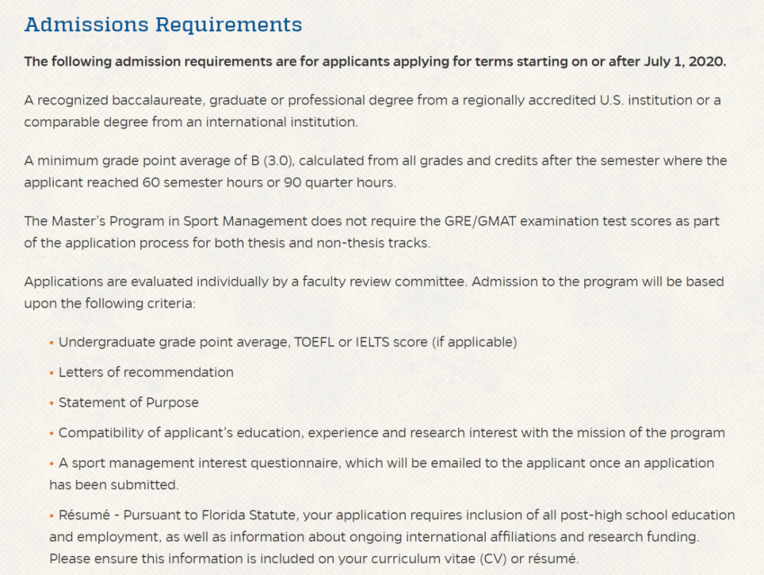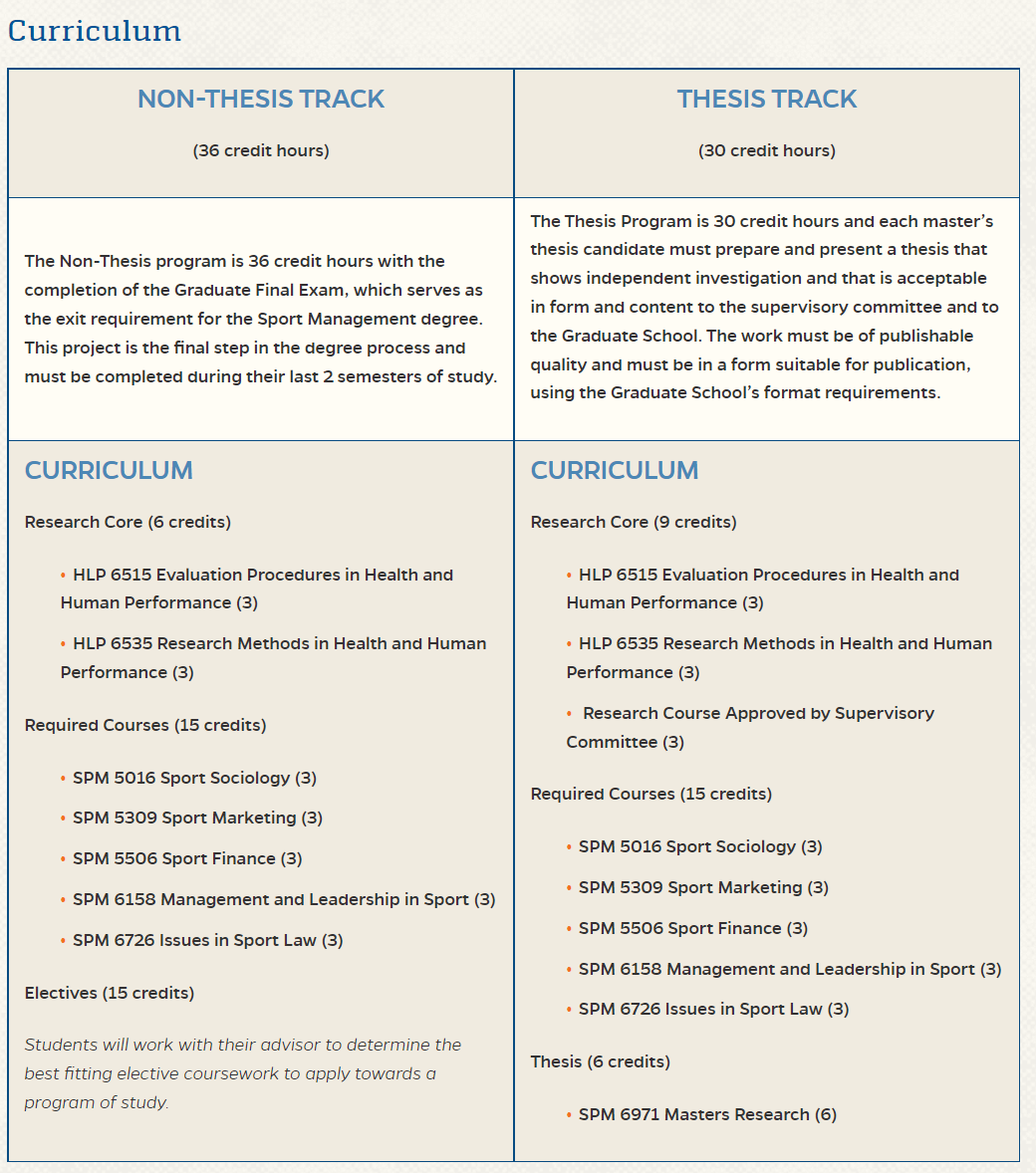 体育管理专业从属于TRSM(tourism, recreation, & sports management)系,HHP(human health & performance)学院。本科生需120学分,研究生需36学分(non-thesis非论文),或30(thesis论文)学分毕业。