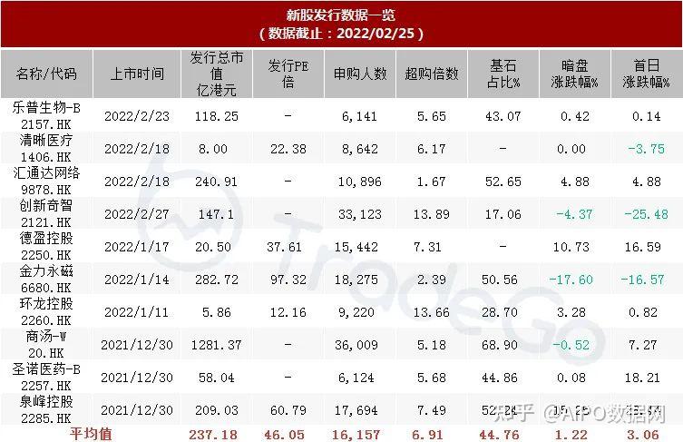 据捷利交易宝数据统计,近10家上市新股发行总市值均值为23718亿,其中最大市值为商汤-W,最小市值为环龙控股;发行PE均值为46.05倍,PE整体水平偏上;申购人数均值为16157人;超购倍数上,均值为6.91倍左右;基石占比上,目前基石比例均值维持在44.76%,整体来说,比例相对合理;暗盘及首日收益率上,今年1月以来好坏参半,2月份,新上市的汇通达表现尚可,清晰医疗则一般,乐普生物-B则微涨。