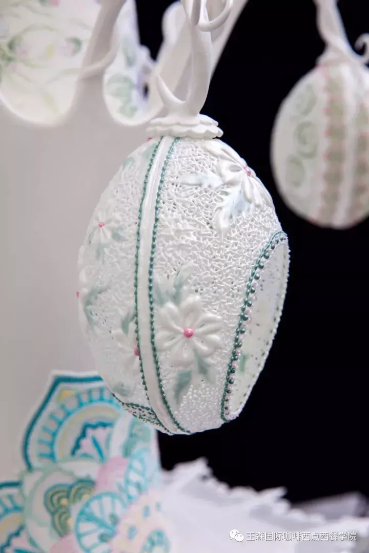 顾碧清:这个作品除了运用国际上常用的工艺技法外,也有一些独创的工艺技法。主要有:蛋白霜线条工艺、蛋糕彩绘、英式仿真糖花、夹色大理石糖皮擀压、立体托模吊线糖片、蛋糕体切除镂空工艺、蛋糕霜平面印花拍点工艺、捏制塑型工艺、蛋白霜一体空心球吊线、结构线条吊线。