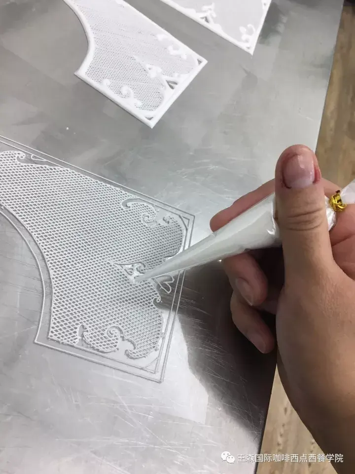 其中蛋白霜线条工艺还包含很多技法,常见技法就是单层或多层直线条吊法,专业称之为英式糖霜吊线,这对一般技术人员来说,只要有耐心都可以做好。蛋白霜线条工艺中最难的是结构线条,所谓结构线条的定义就是用不同形体的吊线组装成不同角度不同层次的线条结构,这需要掌握精准间隙计算、熟悉掌握蛋白霜的软硬性质运用、了解环境湿度和温度的敏感性、了解配方中每款原料的性质掌握等等。
