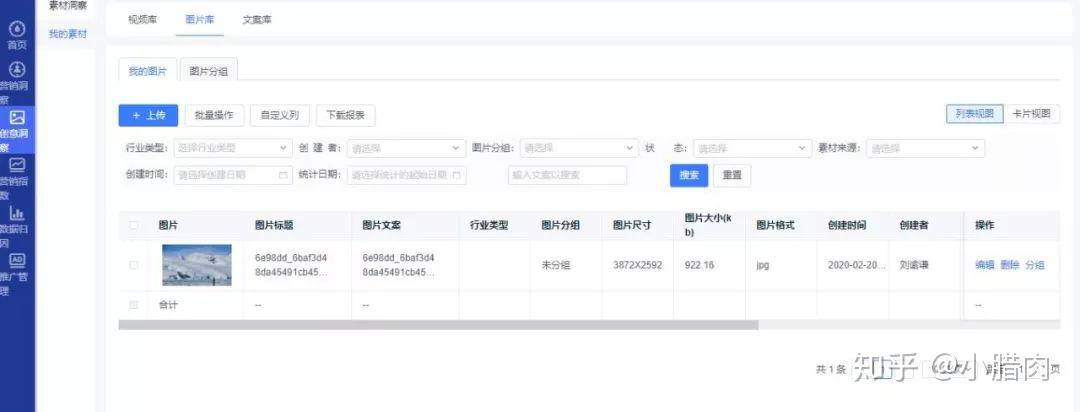 通过文案的列表可以点击进入文案集,可以看到该文案关联的图片或者视频素材以及投放的流量平台。