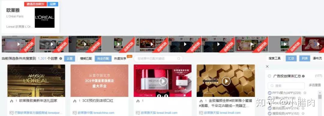 从主页的搜索框搜索关键字后,我们才可以看到素材情报的列表。如果搜索的是品牌,比如巴黎欧莱雅,我们会进入到该品牌下投放过的所有广告页面,而最上面则是Brand Safety功能,为防止品牌在黄赌毒的网站被恶意曝光,损害品牌形象,而进行监控的一种手段。这个功能在品牌广告投放中的需求较广,Ad Bug也是唯一集成了这一功能的平台。