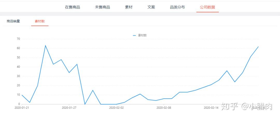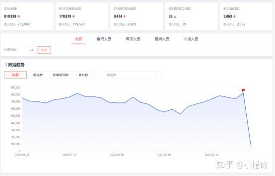 除了以上几点之外,EDX还为用户提供了电商大盘趋势图对销量、商品数、新增商品数、素材数等通过图表的形式展现出来。支持鲁班、枫叶、百度、以及小店进行筛选。
