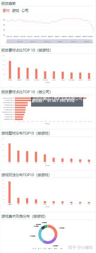 投放趋势会将素材、游戏、公司的投放趋势,投放素材占比(按游戏),投放素材占比(按公司),投放素材占比(按游戏),游戏玩法分布,游戏美术风格分布能等图表进行展示。同时能够对多种条件进行筛选。