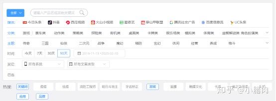 用户可根据广告素材针对产品类别(游戏、应用、品牌)对广告素材的投放媒体、产品行业、主体等进行筛选检索。