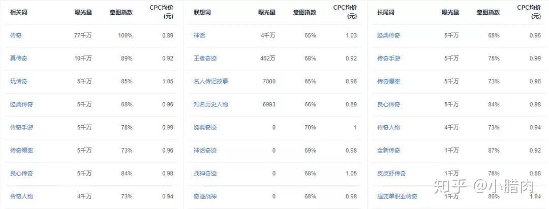 类似百度指数,优化师可以通过搜索诸如“传奇”等关键词,搜索该关键词一段时间的曝光量以及消耗,以及与“传奇”关联的其他联想词。