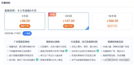应用版、品牌版、游戏版都有很好的行业筛选规则,维度缺少直营电商的筛选逻辑,也就是更细颗粒度的消费品标签。2、行业模板:单个素材下钻维度除了不支持投放公司,其余包含落地页、文案等都支持。3、标准付费账号支持下载。1、价格 & 付费增值 :5.88万/年,没有免费功能。