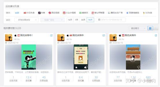 数据最全的情报工具中有,某一视频/图片在某段时间内的曝光,点击,花费,以及其关联的广告文案,谁用过这个素材(跨账号,可以知道具体某个公司)。旁敲侧击了解过数据的获取来源,所有平台都称自己有全网的数据,虽然有些平台的主页只显示可以2000-3000家公司的千万级数据,大大少于我们所知的全量数据 。